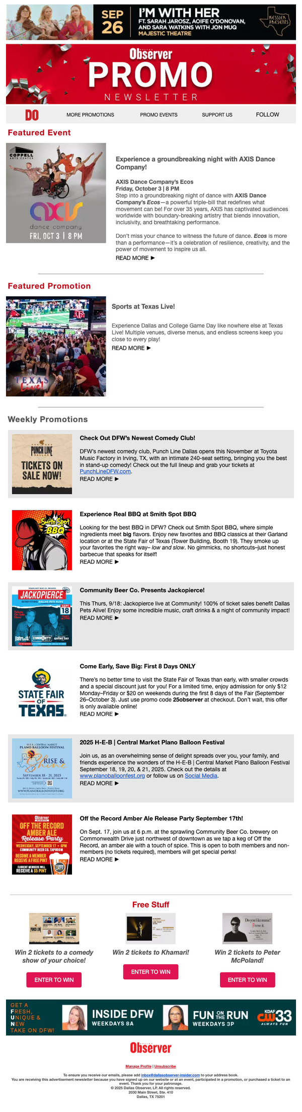 Get access to VIP events, free tickets, prize packages, and special offers available exclusively to our email subscribers. Delivered as needed Monday, Wednesday, and Friday.