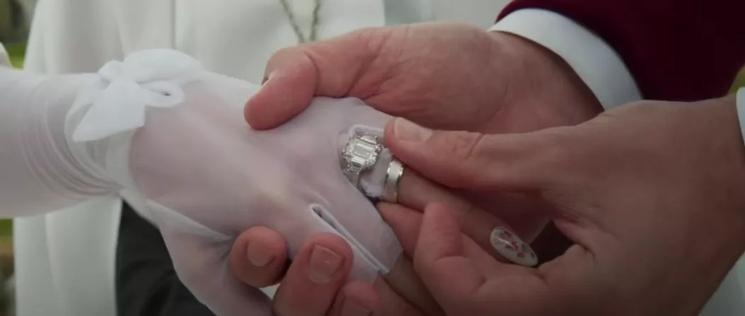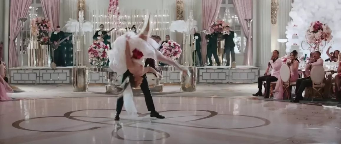 As J.Lo’s voiceover monologue goes on to describe how others view her as a weak, hopeless romantic, we see this shot of a typical sweet wedding. While J.Lo’s questionable bridesmaids’ outfit choices may start to set off some minor red flags, the scene is still unassuming enough to pass as a normal romance movie.