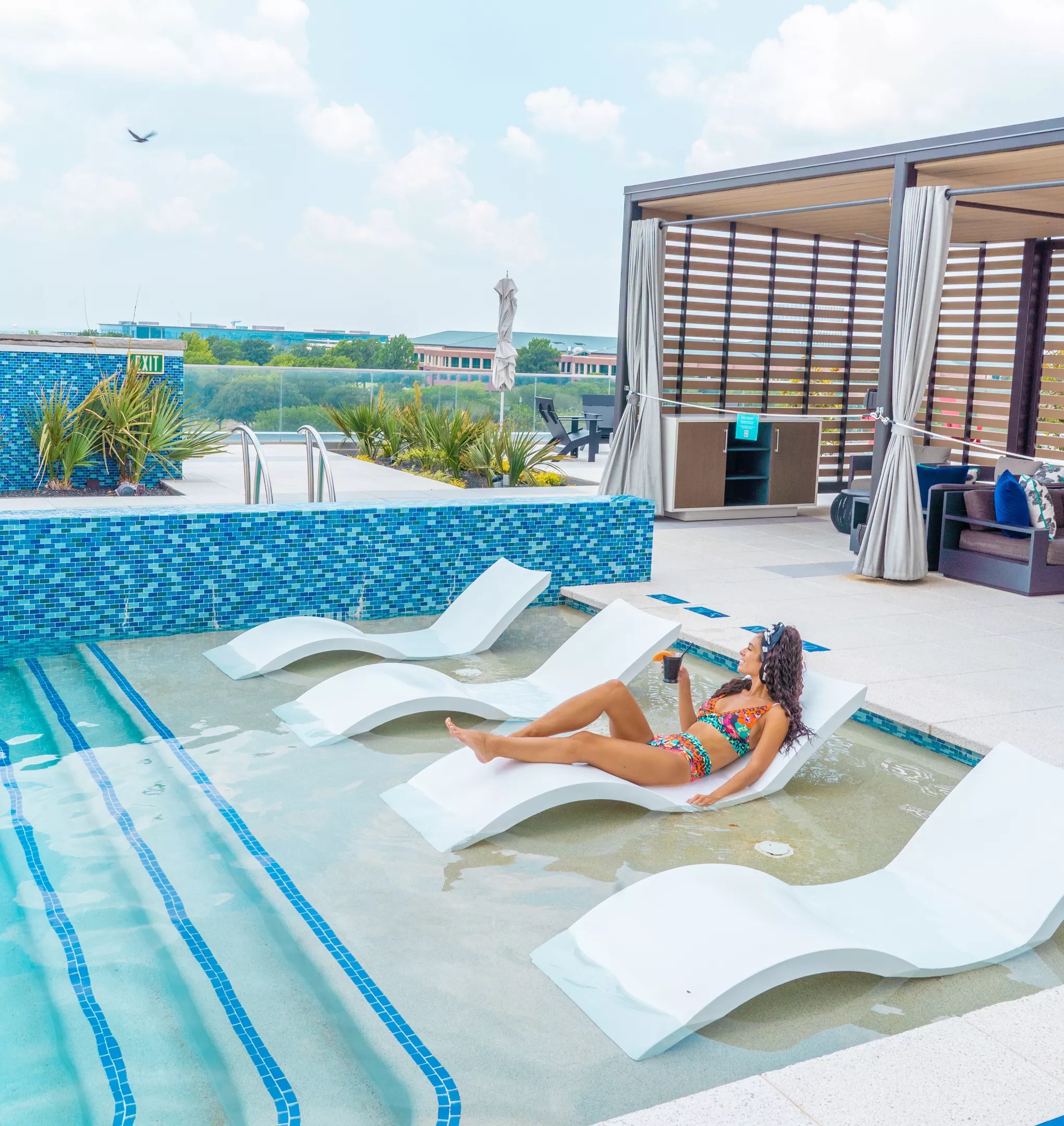The Renaissance Dallas Hotel in Plano is a luxurious retreat that offers an upscale experience with its modern, stylish design. Equipped with lush landscaping and comfortable loungers, the stunning pool area is a serene oasis where guests can unwind and soak up the Texas sun without burning on the spot.