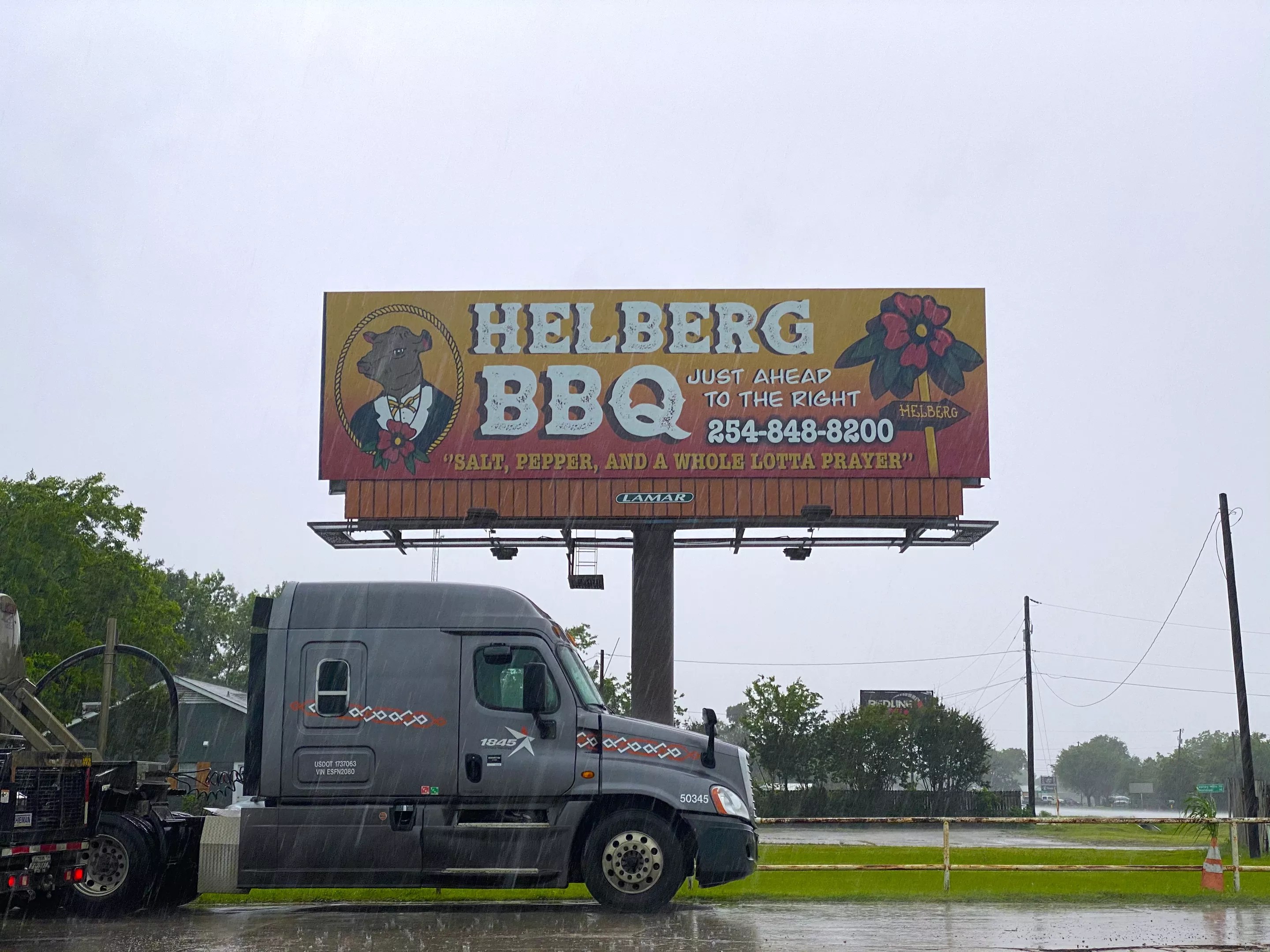 Keep an eye out for this billboard on Highway 6, and the goodness of Helberg Barbecue will be close at hand. (And hopefully, you won’t be looking for this during a late spring deluge like we did.)
