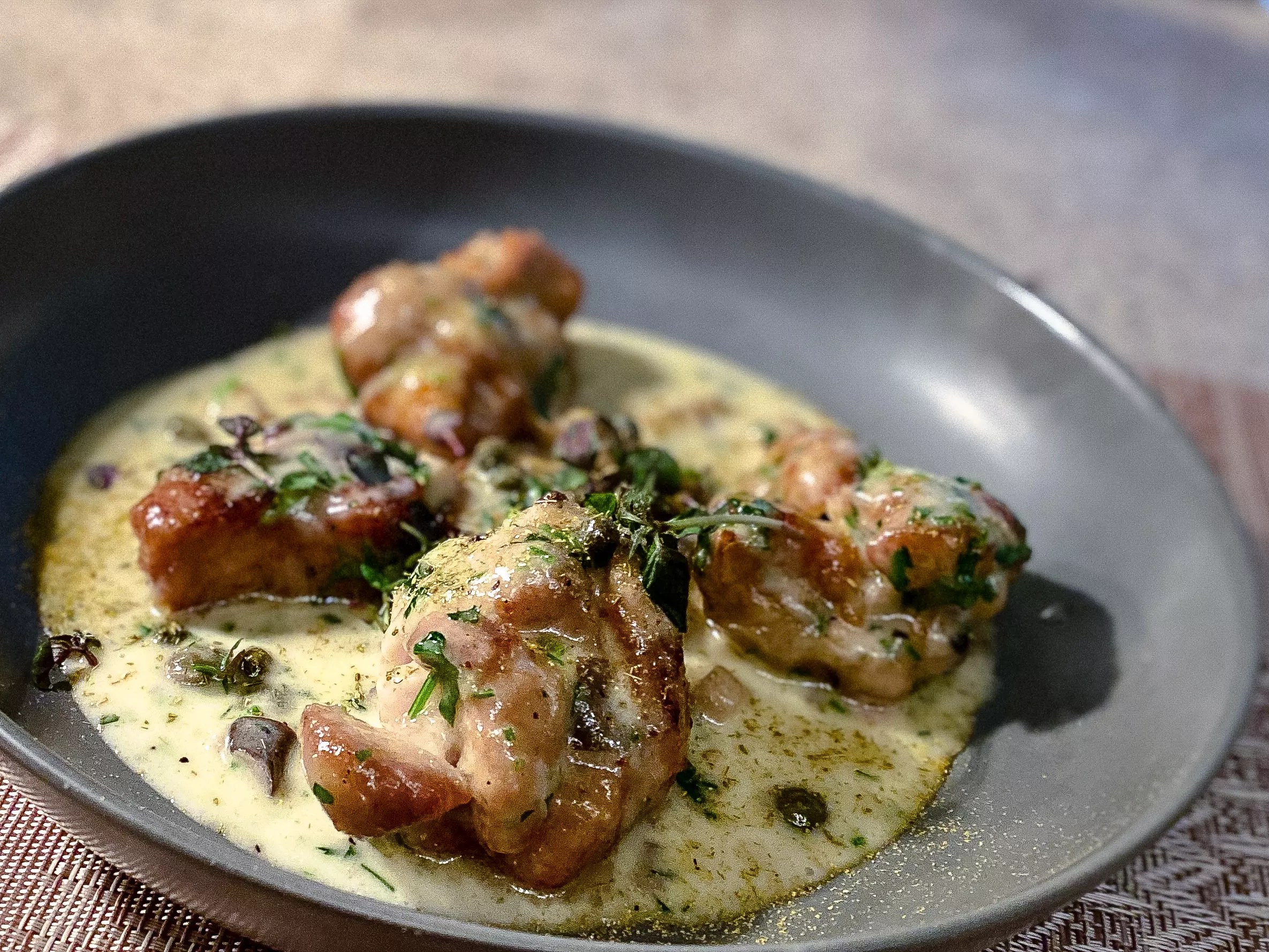 Sweetbread in a lemon tarragon butter sauce with oyster mushrooms.