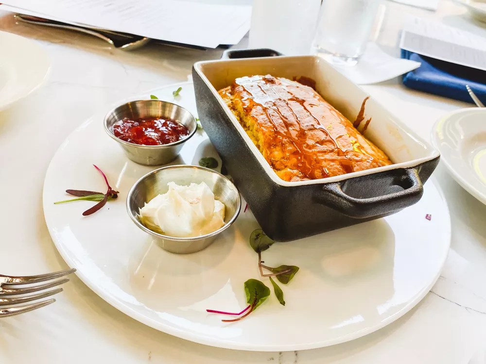 Smoked sea salt-infused butter and house-made strawberry rhubarb preserves come with the skillet cornbread.