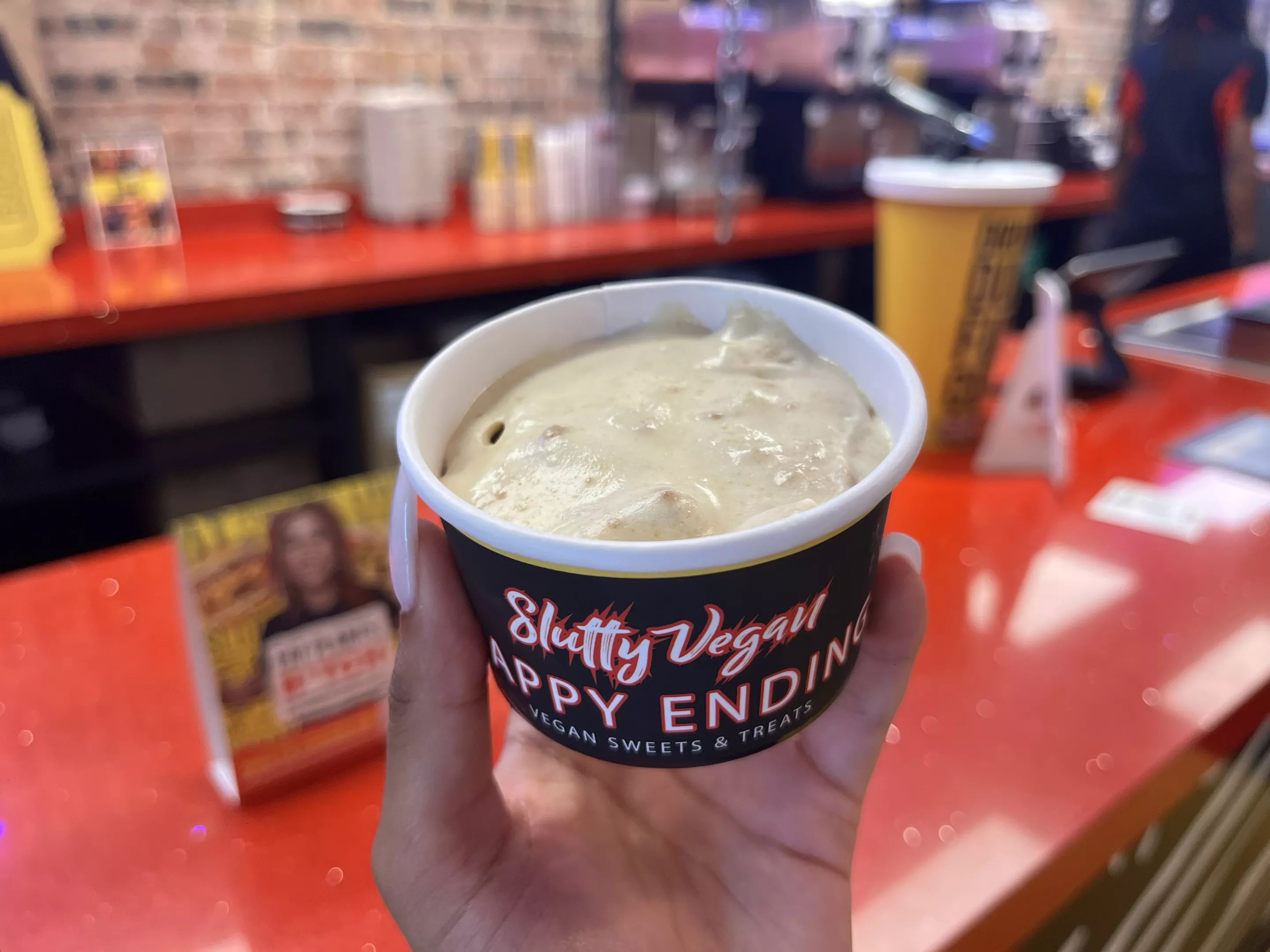 A Slutty Vegan banana pudding is, as the cup promises, a happy ending. This cool dessert tastes much like real dairy and is loaded with ripe banana slices and spiced cookies.