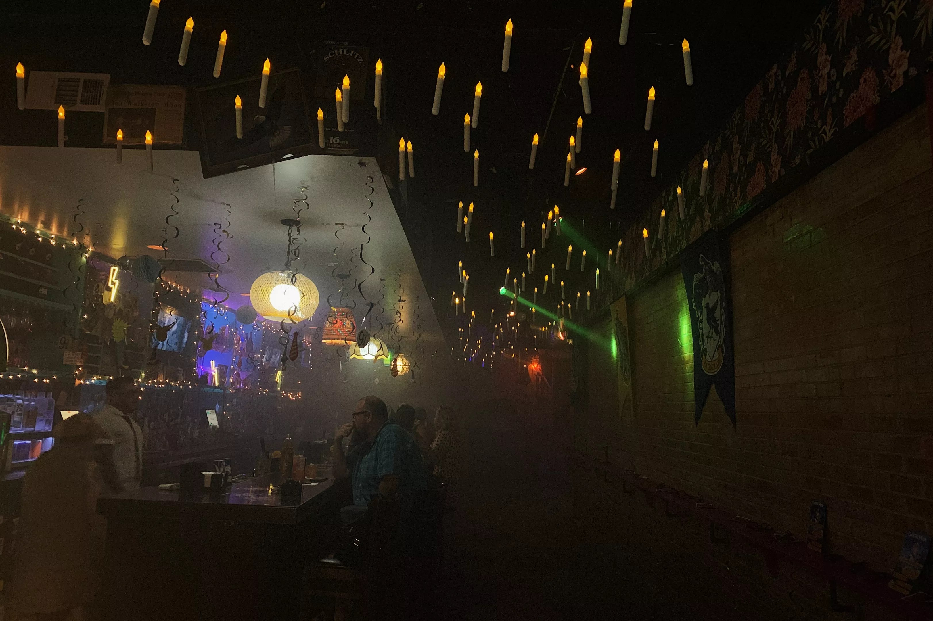 Open the doors, and you’re greeted by a dark, smoky room with the floating candles that look just like those that levitate above the Great Hall, and your favorite bar staff decked out like your favorite characters – think Hufflepuff uniforms, Dobby the house-elf and even a snitch. (Though you’ll have to catch the snitch for a picture, and she’s quite quick!) And make sure to get an eye-full of the sexy portraits of Hermione and Hagrid.