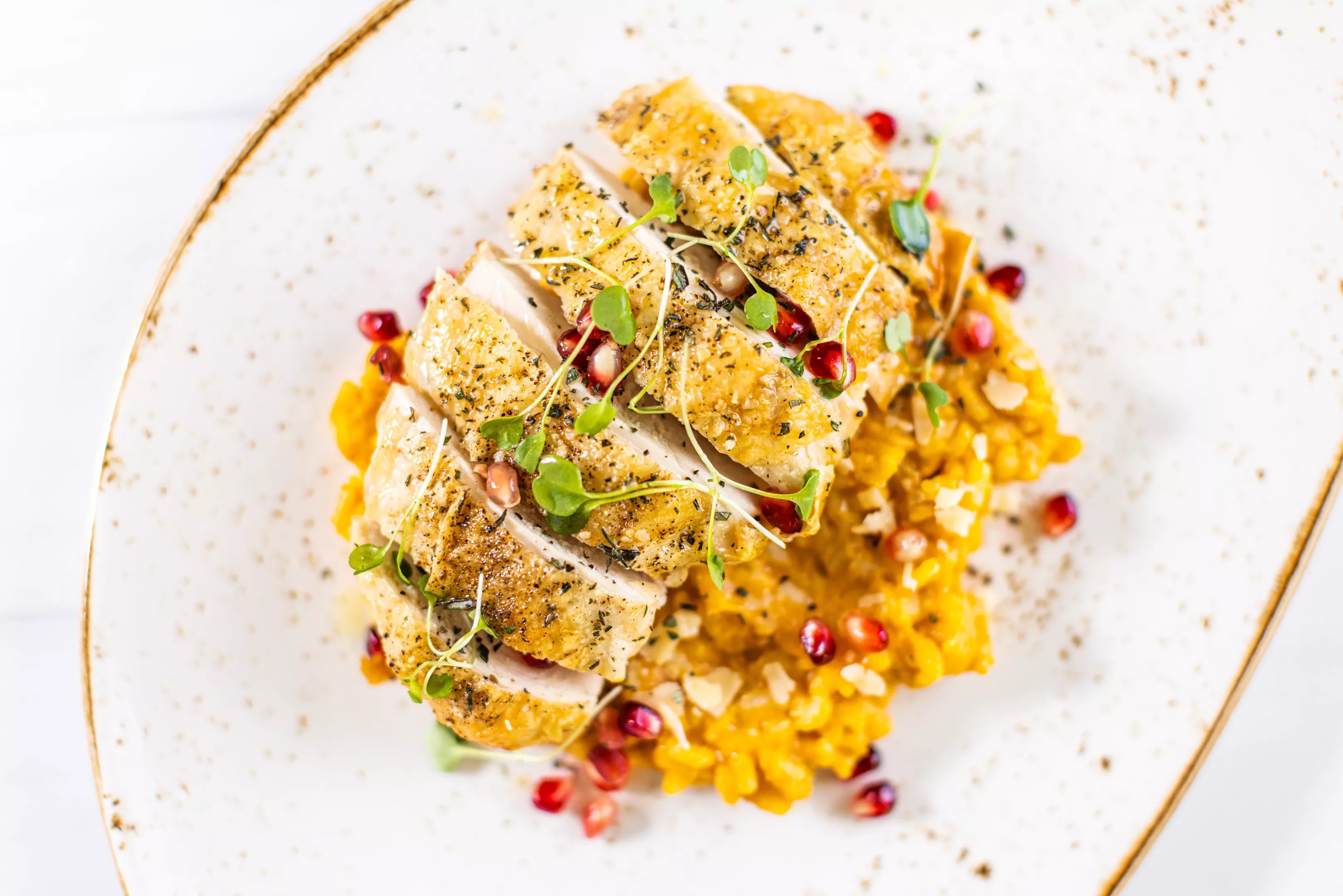 Roasted chicken pumpkin risotto, asiago, truffle, pomegranate