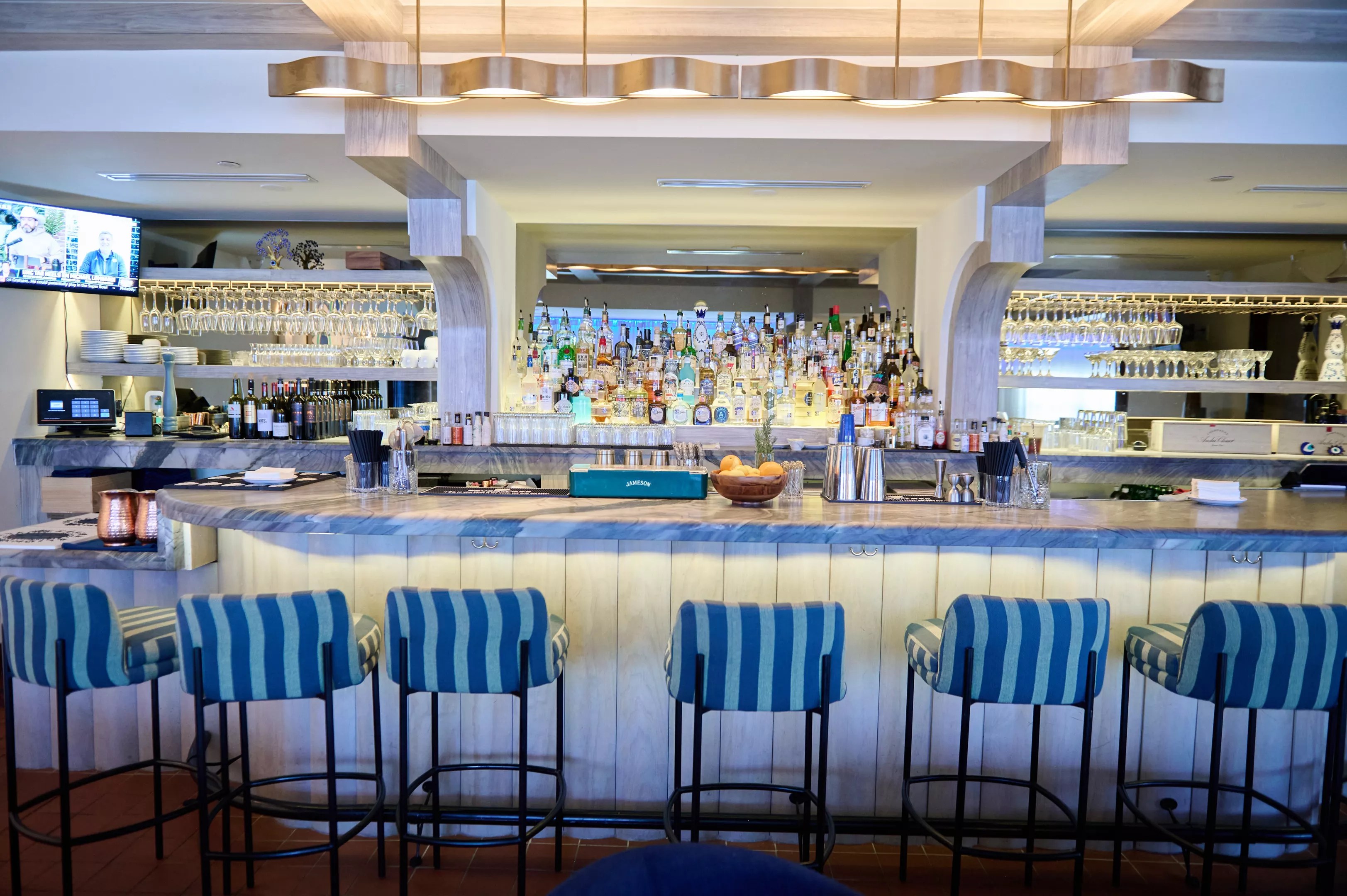 The restaurant isn’t the typical casual Greek spot. The bar area is bathed in marble and blue.