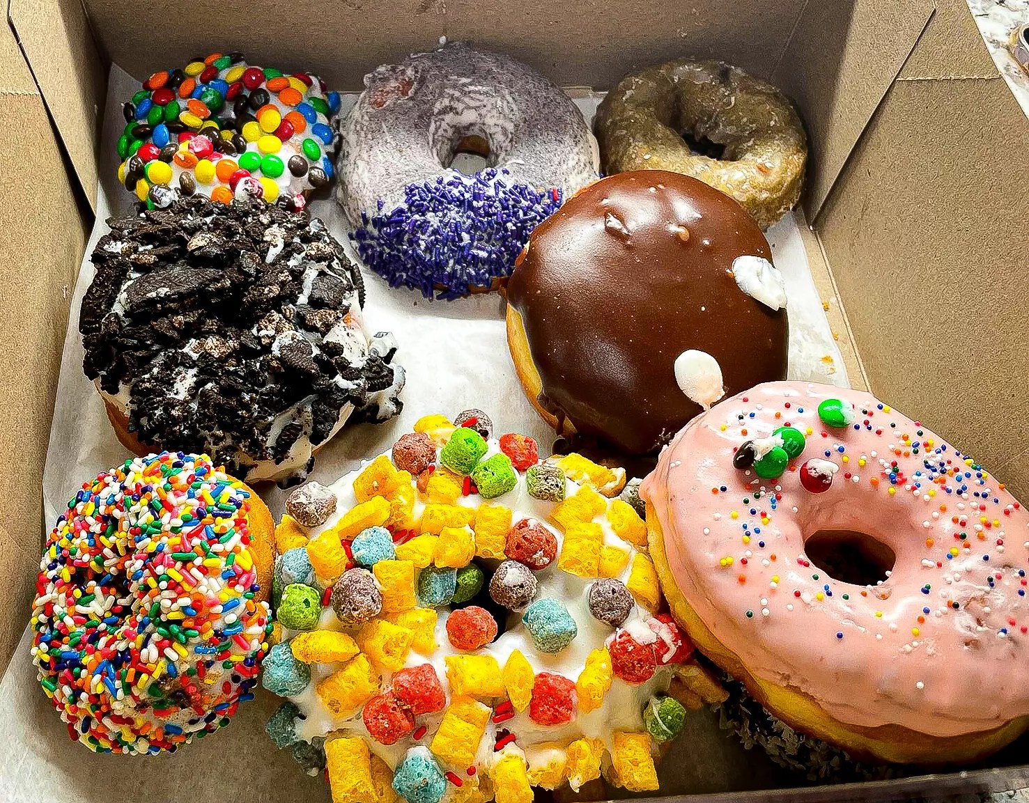 The Marshall Mathers is plain cake with vanilla frosting, topped with dozens of mini M&M candies. (The rapper Eminem’s name is Marshall Mathers.) Similar to the Oh Captain, My Captain (raised yeast doughnut with vanilla frosting, topped with Cap’n Crunch cereal) and The Dirt (raised yeast doughnut with vanilla frosting, topped with crumbled Oreo cookies), the candy-coated Marshall Mathers could’ve overwhelmed with a rush of sugar, but none of them did.