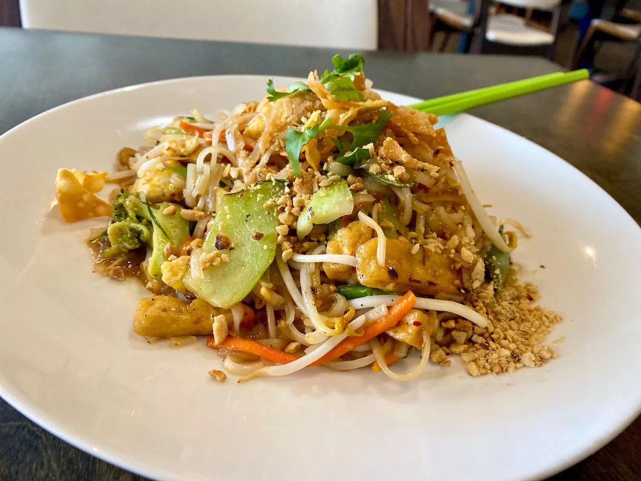 And, yes, the pad Thai here is amazing. The one word that keeps coming to mind is “bright”: in flavor, texture, heat and freshness. Wok-tossed rice noodles, vegetables and tofu carry a thin coat of tamarind sauce that thankfully isn’t too sweet. Peanuts and bits of crispy wonton give each bit a different texture. Vegetables and blocks of seared tofu are a just touch crisp on the outside.